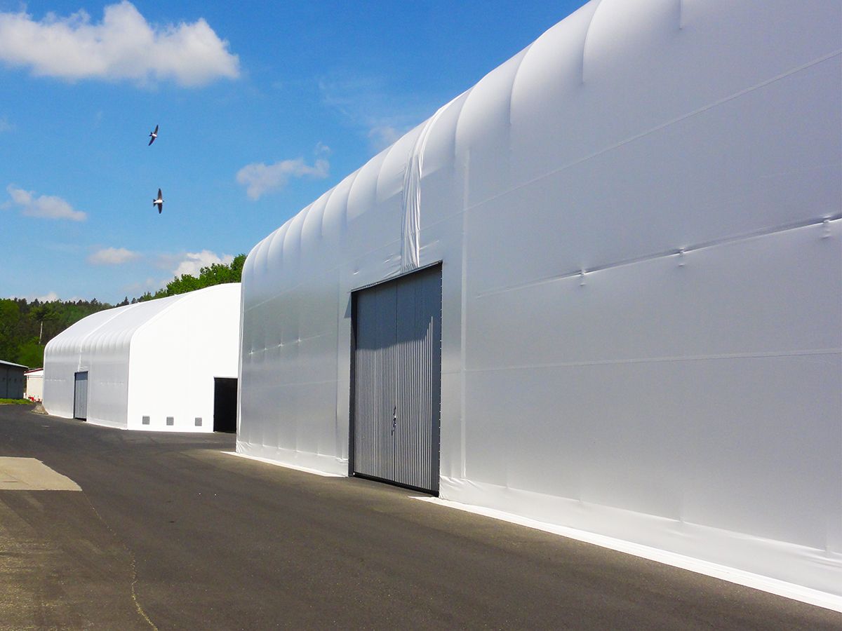 Die Halle wurde auf einem bestehenden Asphaltuntergrund errichtet, ergänzt um Maßnahmen gegen das Eindringen von Wasser in die Halle. An Front und Seite der Halle sind zweiflügelige Schiebetore installiert. Die Hallenverkleidung besteht aus weißer Textilie mit einem Flächengewicht von 900 g/m².