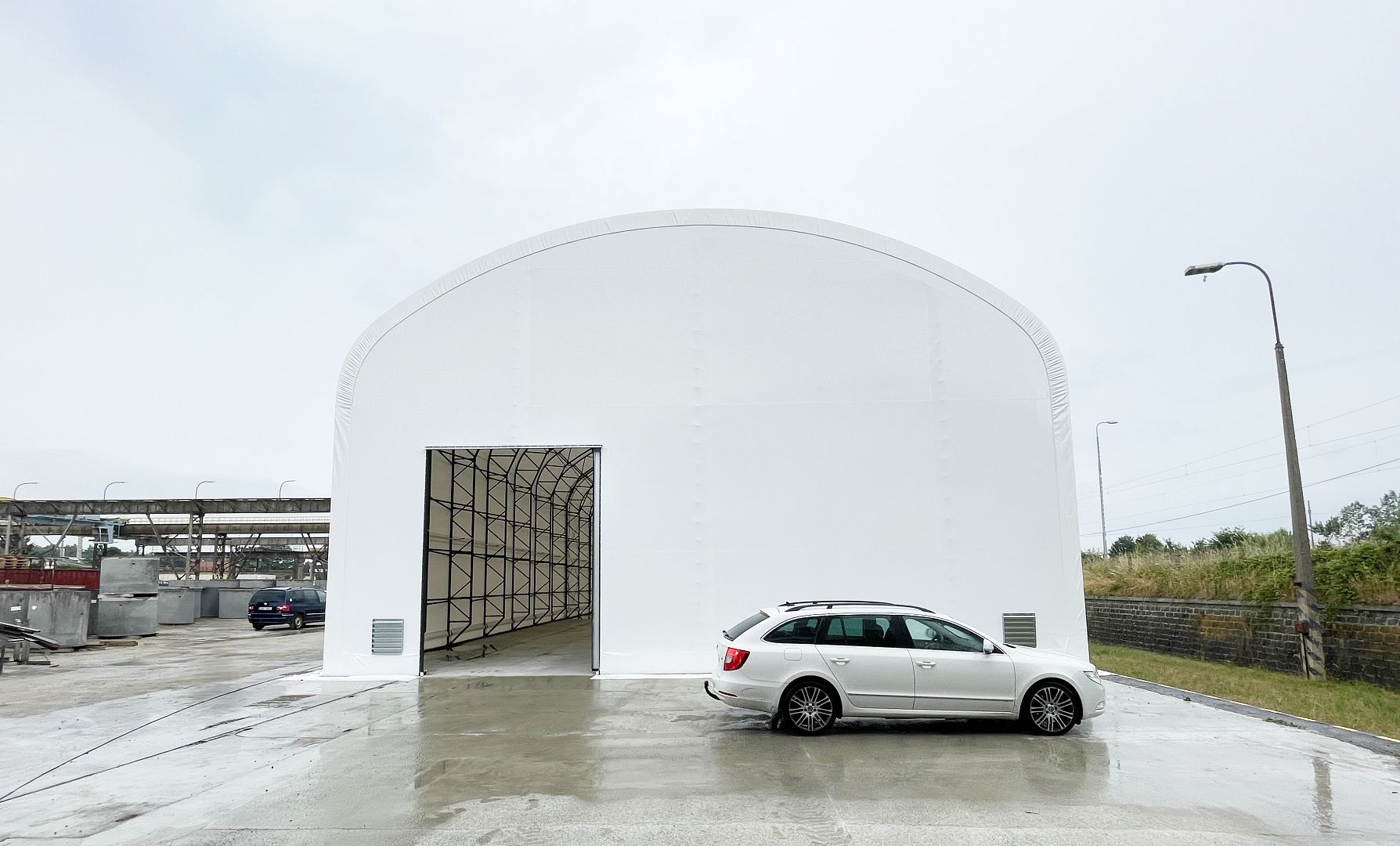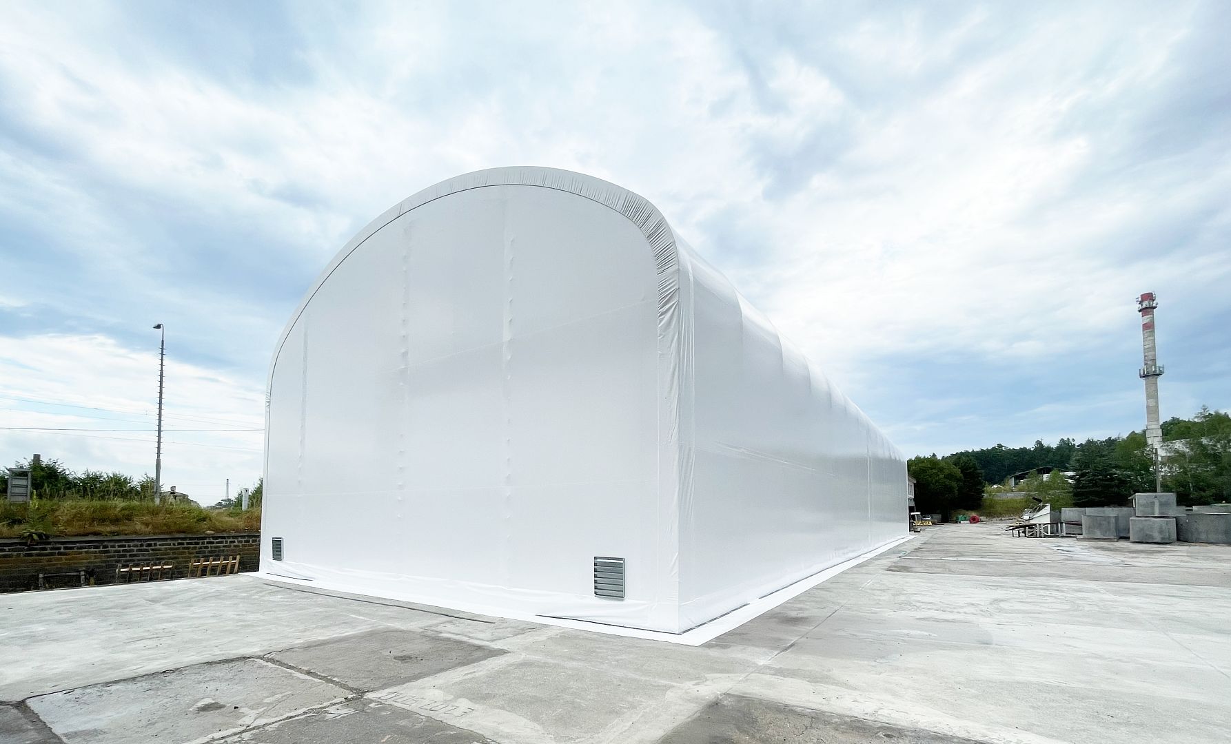 Die Konstruktion besteht vollständig aus Stahl. Die montierte Halle wurde auf einem Betonuntergrund errichtet; an der Hallenfront befindet sich ein Schiebetor. Die Verkleidung besteht aus hochbeständiger technischer Textilie. Die Halle befindet sich in der Schneelastzone II. Als Zubehör sind Lüftungsöffnungen und Beleuchtung vorgesehen.