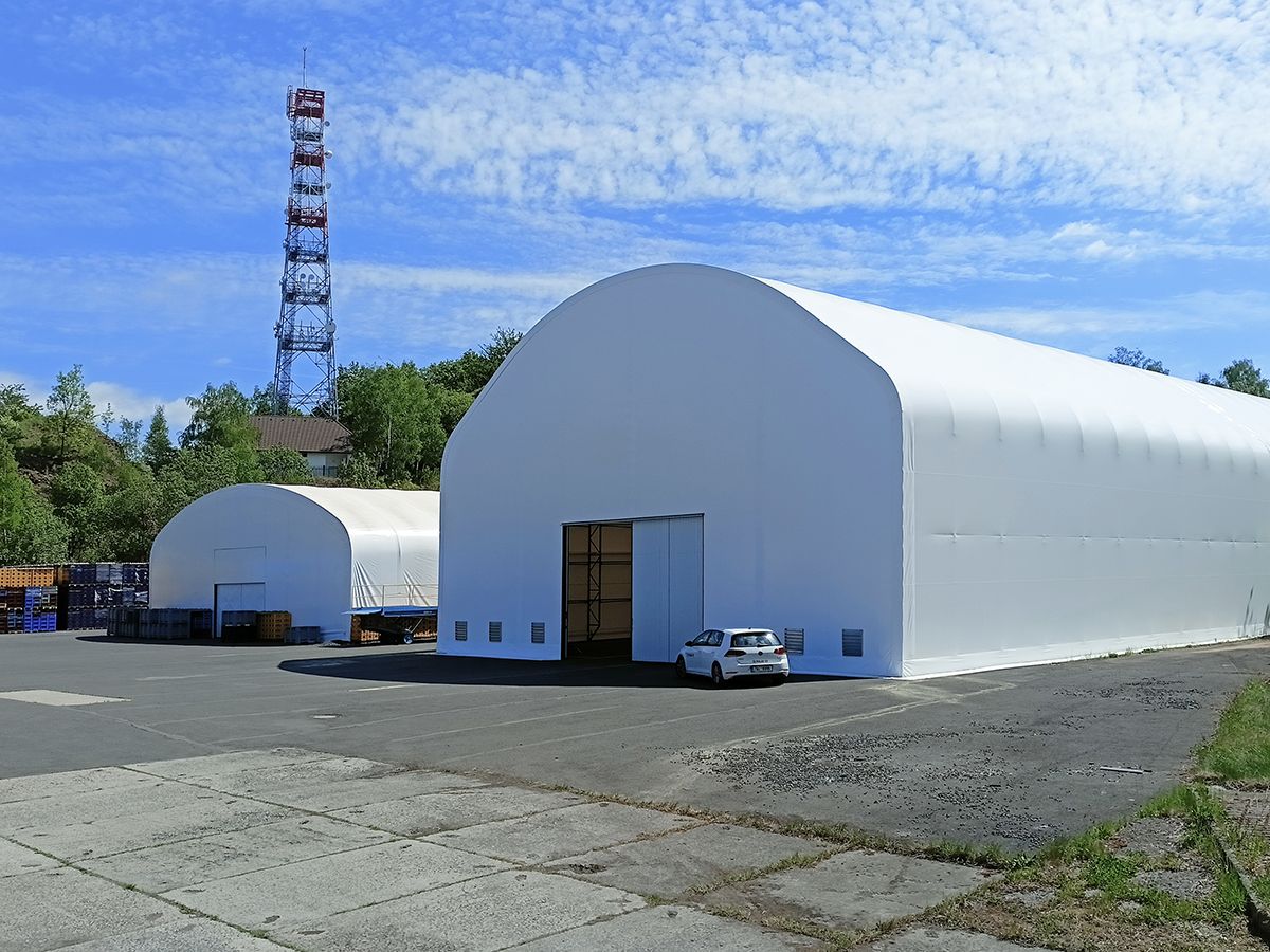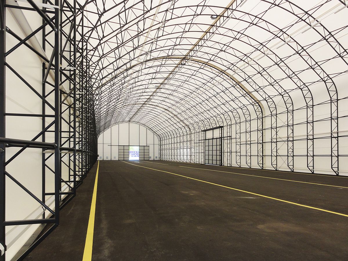 The hall was built on an existing asphalt base with additional measures to prevent water ingress. Double-leaf sliding doors are installed both at the front and on the side of the hall. The hall cladding is made of white technical fabric with an areal weight of 900 g/m².