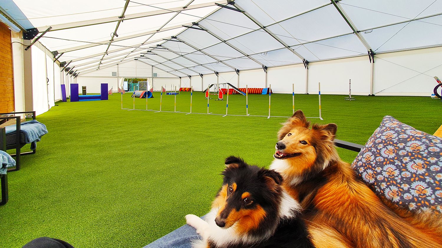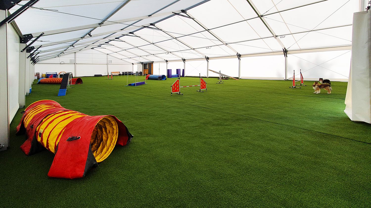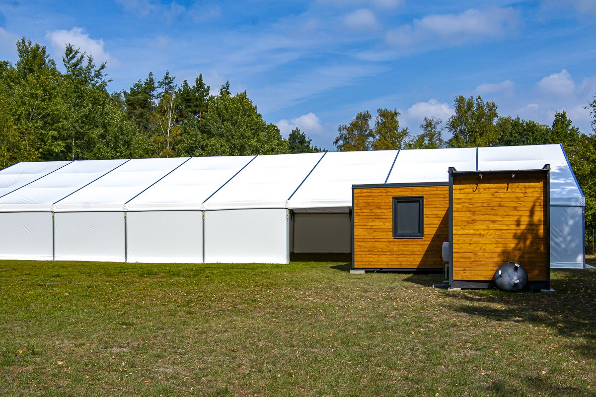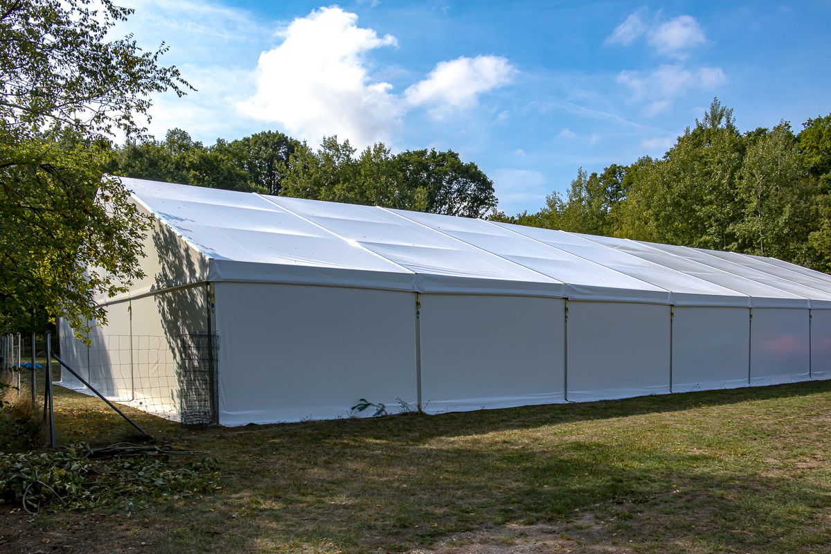 The tent hall with a lightweight aluminum structure is installed on an existing grass surface. Levelling of uneven terrain is handled using an adjustable steel base plate. The total length consists of 8 four-metre modules. This modular system allows the tent hall to be easily shortened or extended.