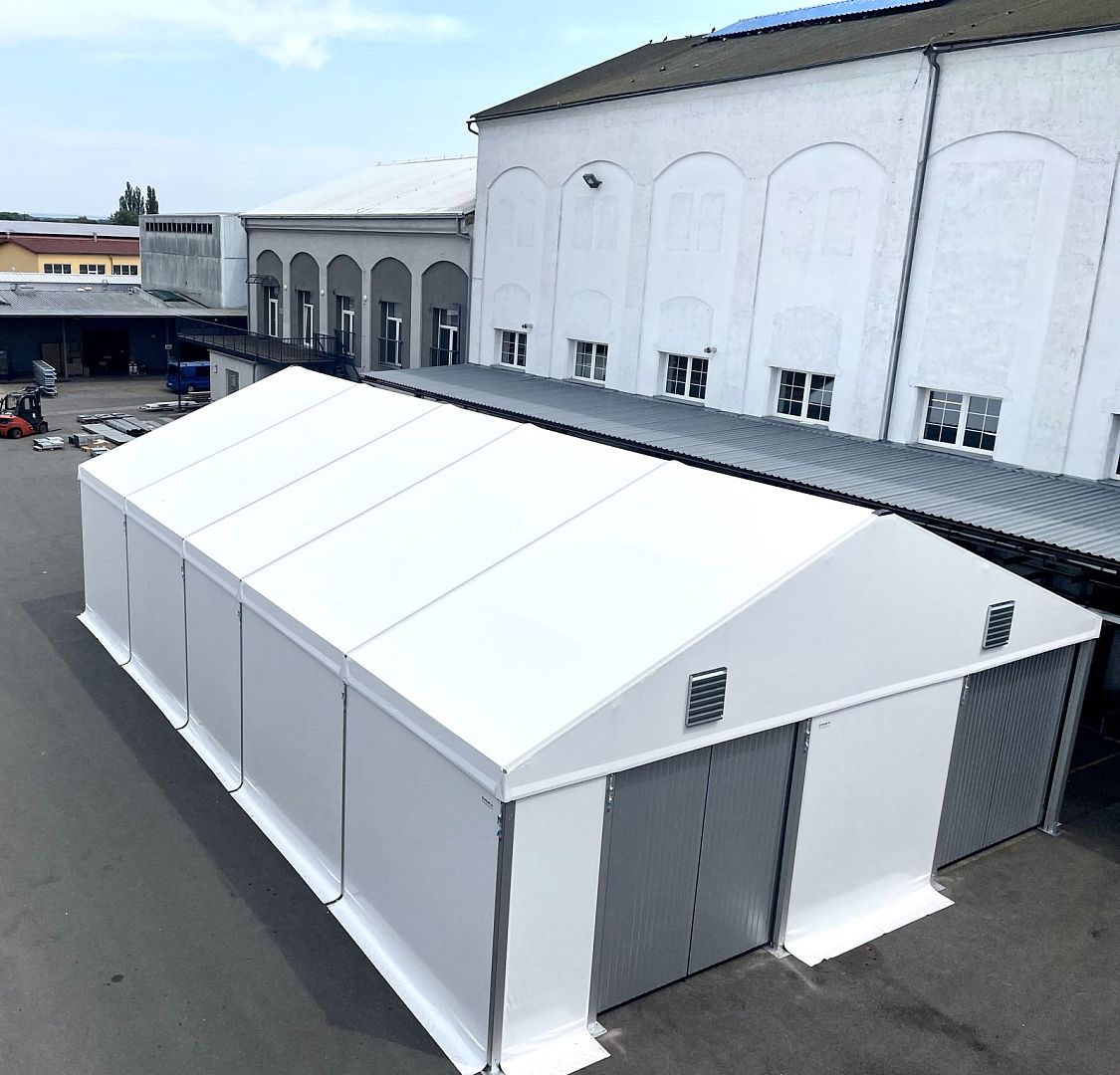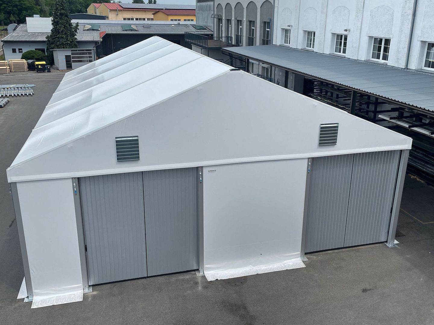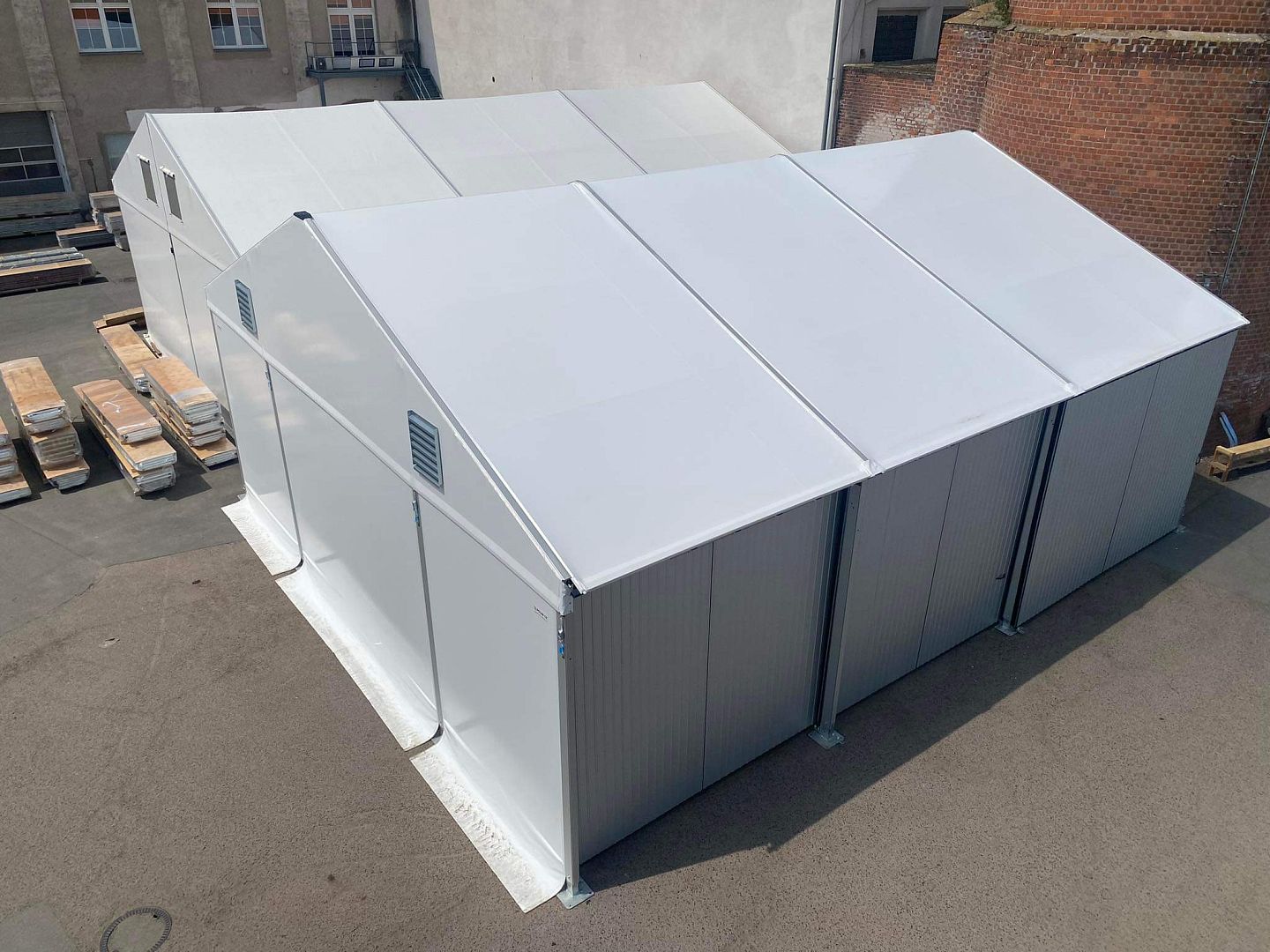 Two lightweight tent halls used as storage facilities.