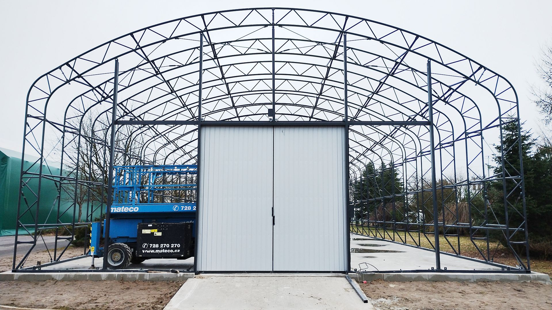 The hall features a fully steel structure and is installed on a concrete base. Sliding doors are located at the front gable end. The hall is clad with highly durable technical textile. The structure is situated in Snow Load Zone V. Additional features include ventilation openings and lighting.